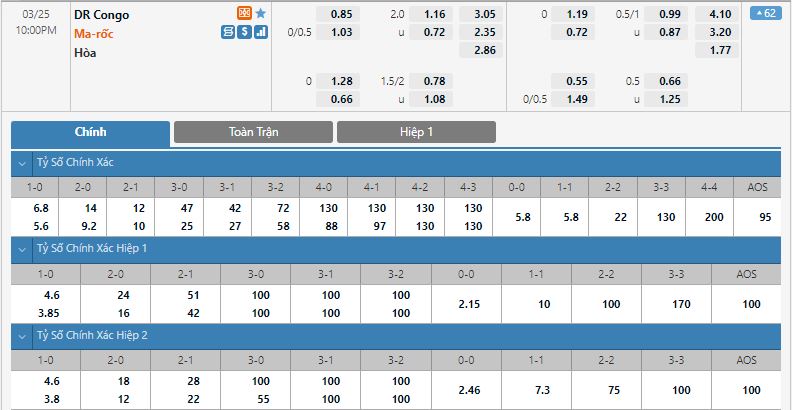 - Kèo tỉ số hiệp 1: D.R. Congo 0-0 Ma Rốc