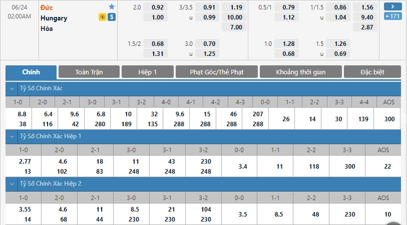 Bảng tỷ lệ kèo trực tuyến trận đấu Đức vs Hungary