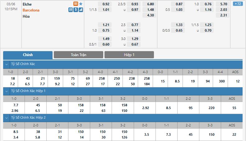 Bảng tỷ lệ kèo bóng đá Elche vs Barcelona