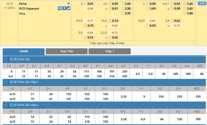Bảng tỷ lệ kèo trực tuyến trận đấu Elche vs Espanyol:
