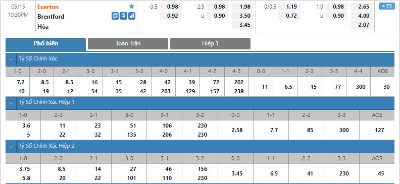 - Kèo tỉ số hiệp 1: Everton 1-1 Brentford