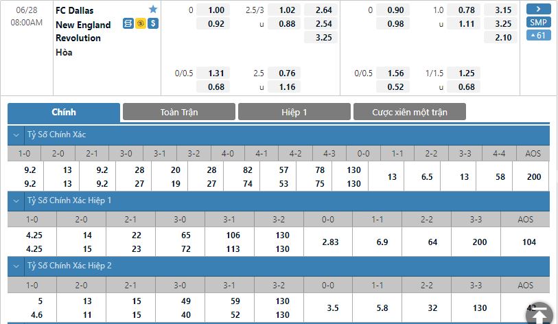 Bảng tỷ lệ kèo bóng đá FC Dallas vs New England Revolution