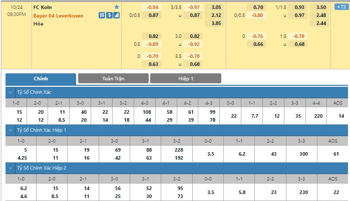 Bảng tỷ lệ kèo trực tuyến trận đấu FC Koln vs Bayer Leverkusen: