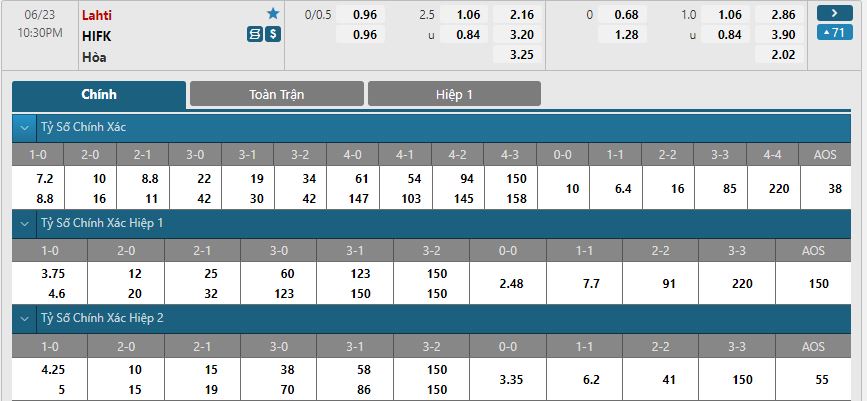 Bảng tỷ lệ kèo trực tuyến trận đấu FC Lahti vs HIFK Elsinki: