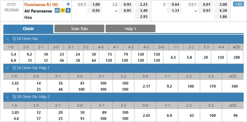 Bảng tỷ lệ kèo trực tuyến trận đấu Fluminense vs Atletico Paranaense