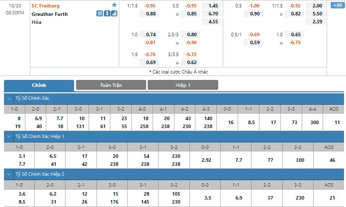 Bảng tỷ lệ kèo trực tuyến trận đấu Freiburg vs Greuther Furth: