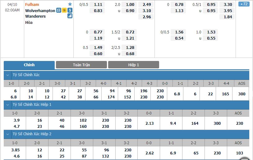 Bảng tỷ lệ kèo bóng đá Fulham vs Wolves