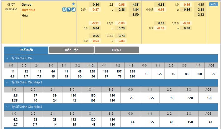 Bảng tỷ lệ kèo trực tuyến trận Genoa vs Juventus: