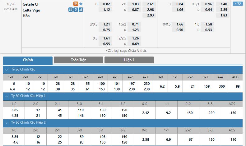 Bảng tỷ lệ kèo trực tuyến trận đấu Getafe vs Celta Vigo
