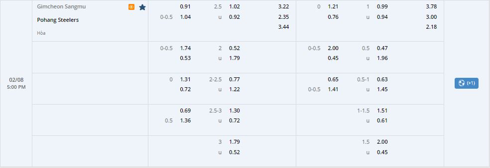 Bảng tỷ lệ kèo trực tuyến trận Gimcheon Sangmu vs Pohang Steelers