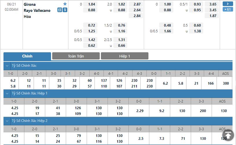 Bảng tỷ lệ kèo bóng đá Girona vs Rayo Vallecano