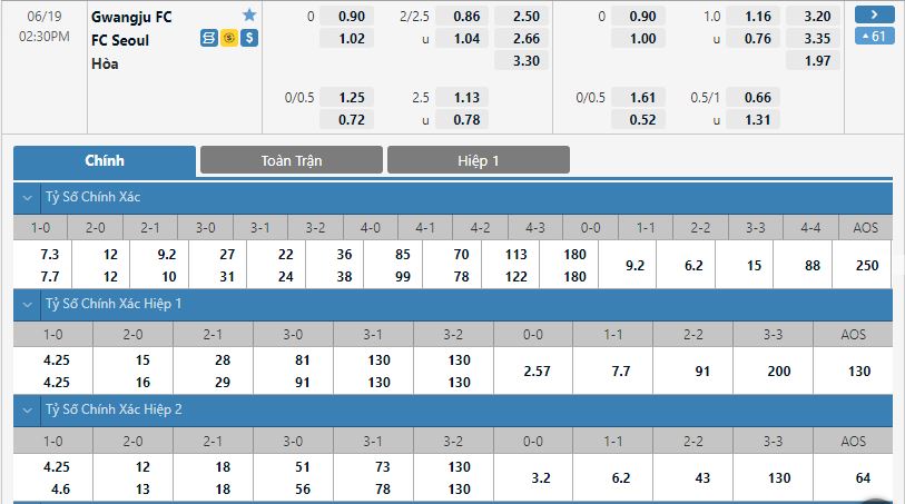 Bảng tỷ lệ kèo bóng đá Gwangju FC vs FC Seoul