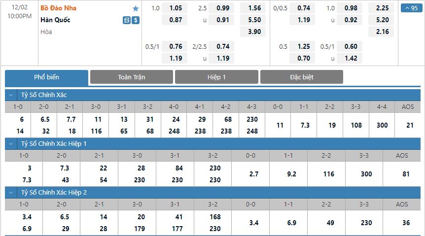 Bảng tỷ lệ kèo trực tuyến trận Hàn Quốc vs Bồ Đào Nha