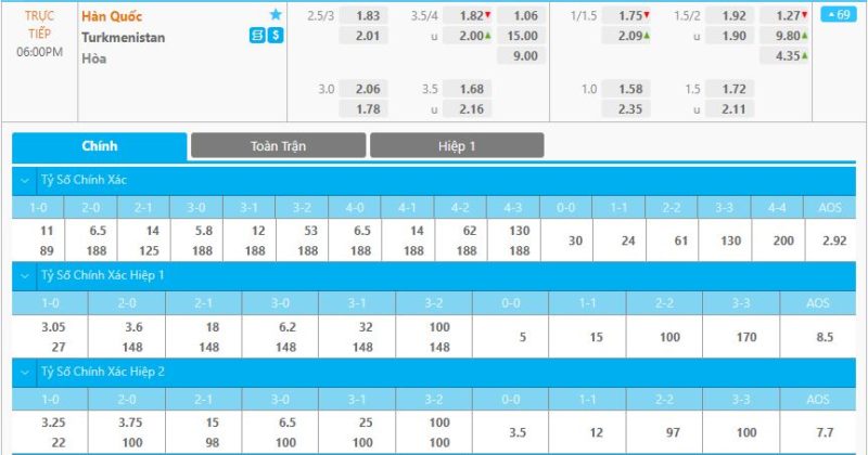 Bảng tỷ lệ kèo trực tuyến trận đấu Hàn Quốc vs Turkmenistan: