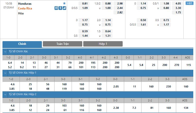 Bảng tỷ lệ kèo trực tuyến trận đấu Honduras vs Costa Rica