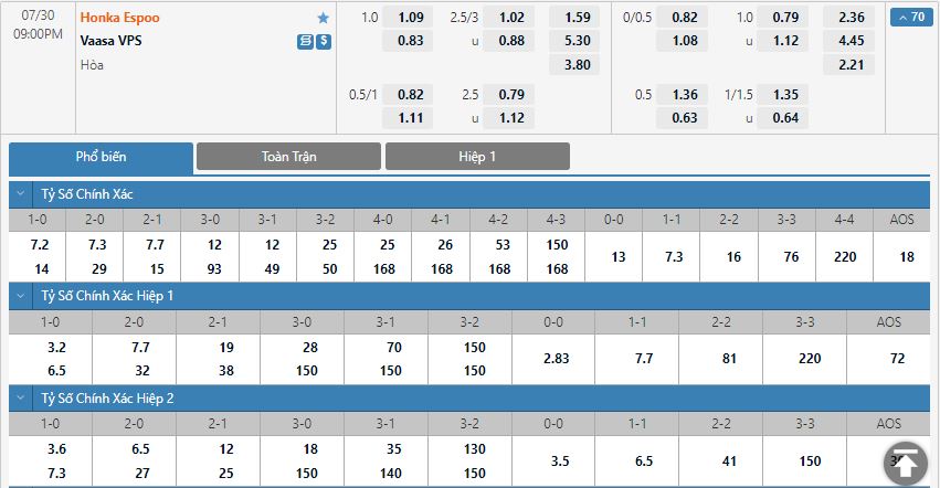 Bảng tỷ lệ kèo trực tuyến trận Honka vs VPS Vaasa