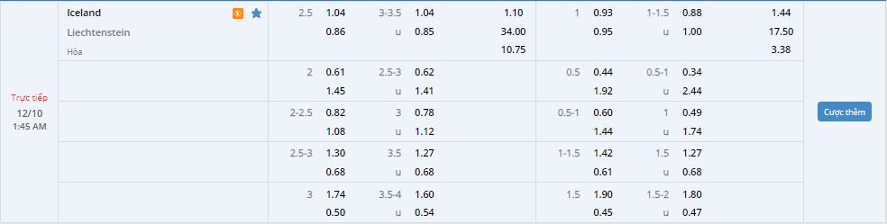 Bảng tỷ lệ kèo bóng đá Iceland vs Liechtenstein