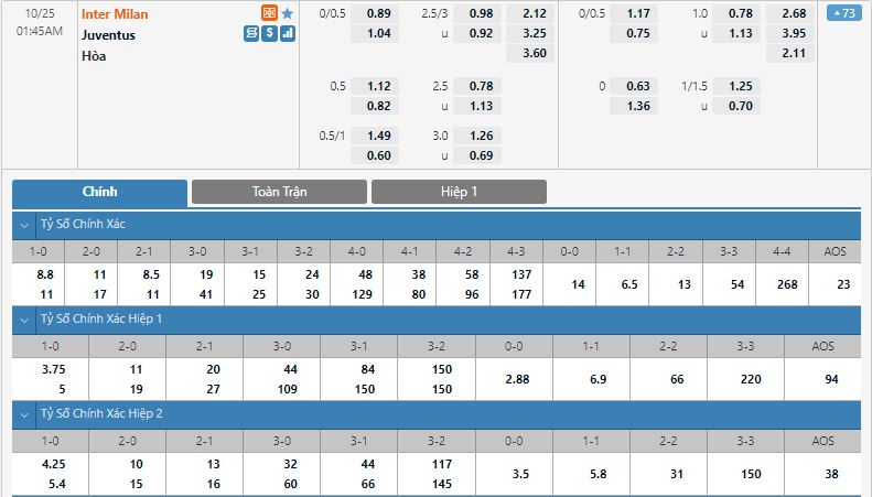Bảng tỷ lệ kèo bóng đá Inter vs Juventus