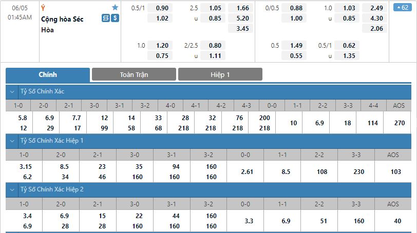 Bảng tỷ lệ kèo trực tuyến trận đấu Italia vs CH Czech