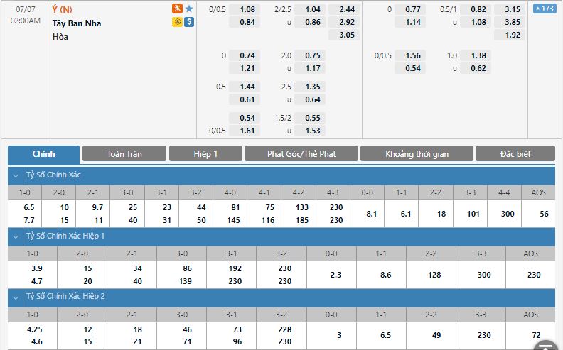 Bảng tỷ lệ kèo trực tuyến trận đấu Italia vs Tây Ban Nha