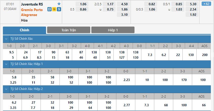 - Kèo tỉ số hiệp 1: Juventude 0-0 Gremio