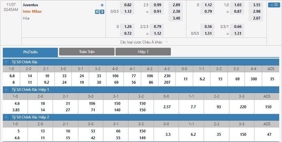 Bảng tỷ lệ kèo trực tuyến trận đấu Juventus vs Inter