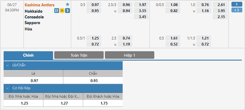 Bảng tỷ lệ kèo trực tuyến trận đấu Kashima vs Consadole Sapporo