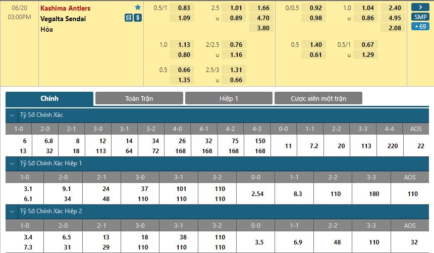 Bảng tỷ lệ kèo trực tuyến trận đấu Kashima vs Vegalta Sendai: