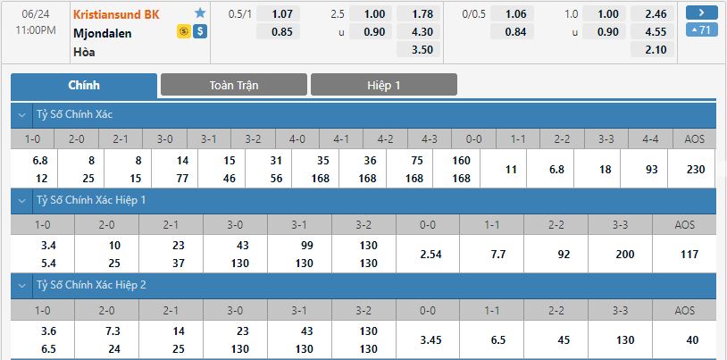 Bảng tỷ lệ kèo bóng đá Kristiansund BK vs Mjondalen