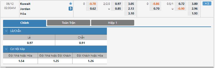 Bảng tỷ lệ kèo trực tuyến trận đấu Kuwait vs Jordan: