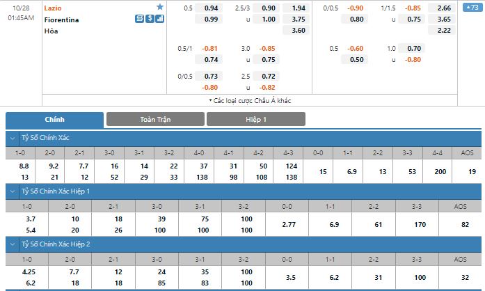 Bảng tỷ lệ kèo trực tuyến trận đấu Lazio vs Fiorentina: