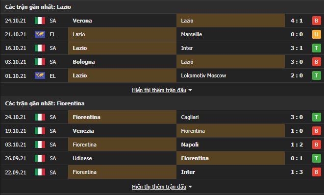 Phong độ gần đây Lazio vs Fiorentina: