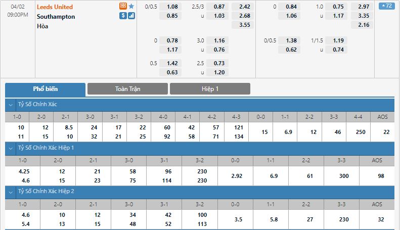 Bảng tỷ lệ kèo bóng đá Leeds United vs Southampton