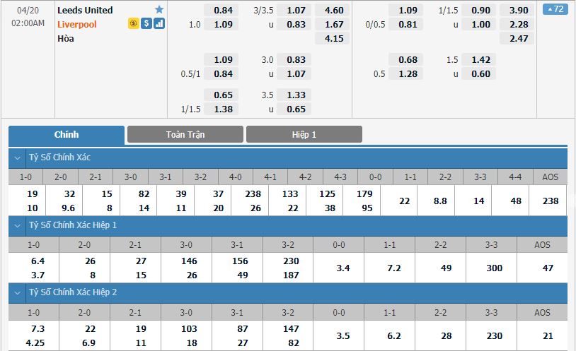 Bảng tỷ lệ kèo bóng đá Leeds vs Liverpool