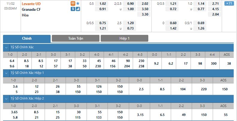- Kèo tỉ số hiệp 1: Levante 0-0 Granada CF