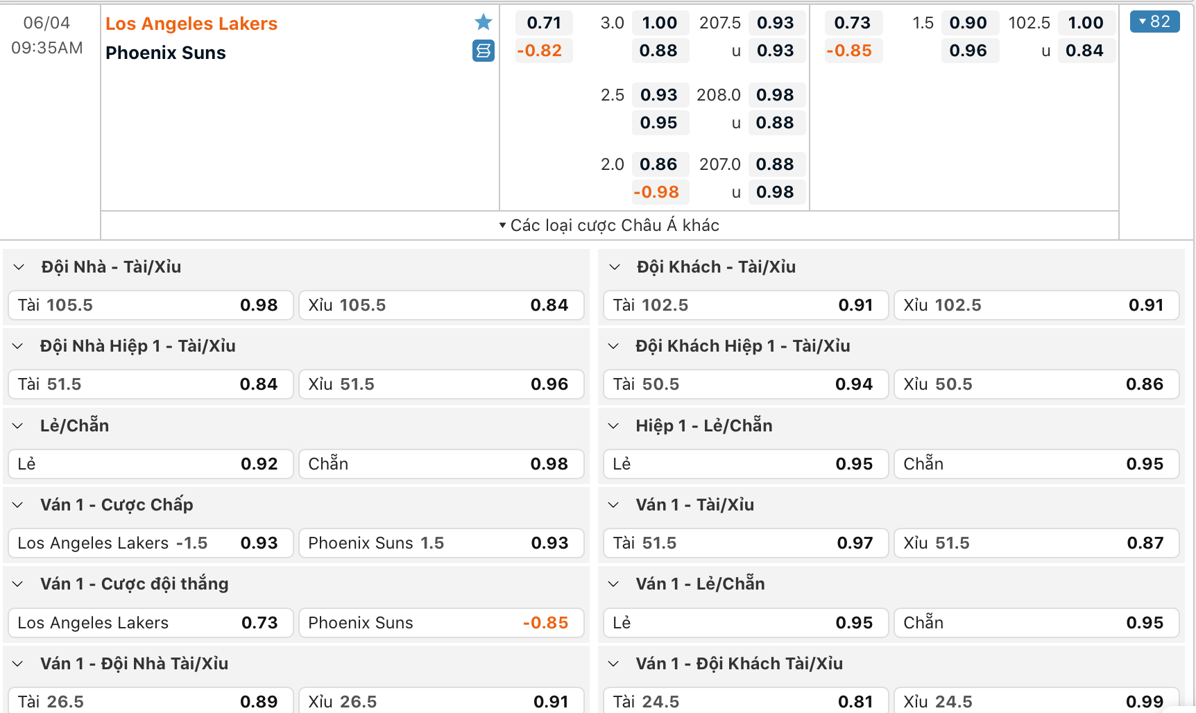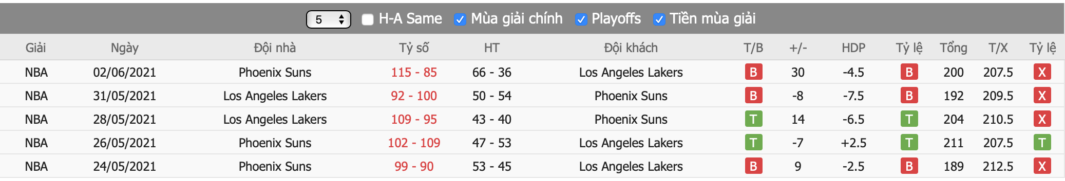 Bảng tỷ lệ kèo Los Angeles Lakers vs Phoenix Suns