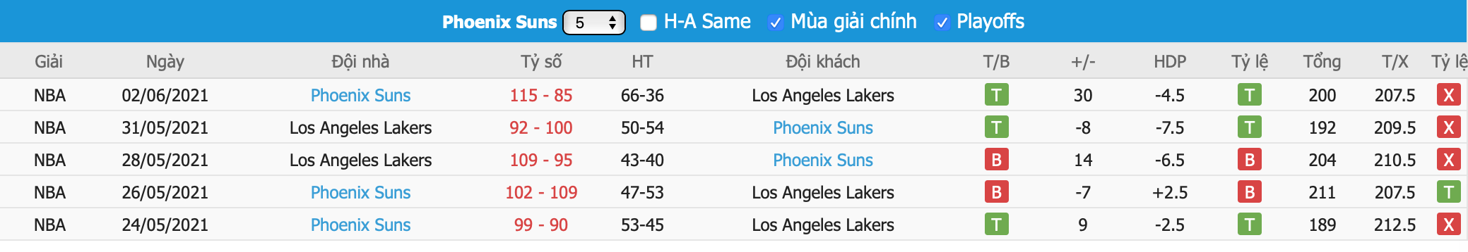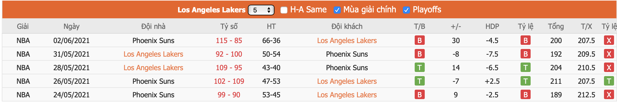 Thành tích đối đầu Los Angeles Lakers vs Phoenix Suns
