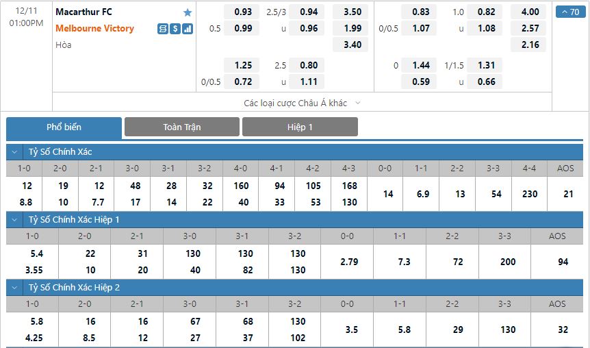 - Kèo tỉ số hiệp 1: Macarthur FC 0-0 Melbourne Victory