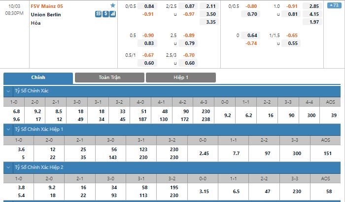Bảng tỷ lệ kèo trực tuyến trận đấu Mainz vs Union Berlin: