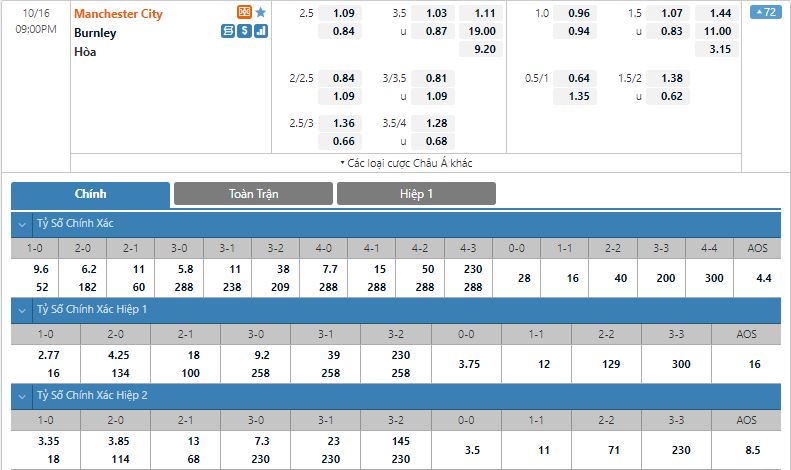 Bảng tỷ lệ kèo bóng đá Manchester City vs Burnley