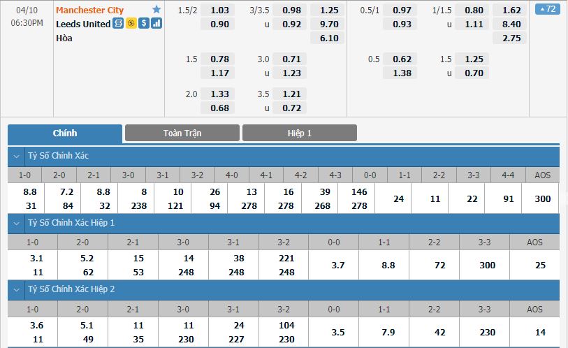 - Kèo tỉ số hiệp 1: Manchester City 2-0 Leeds