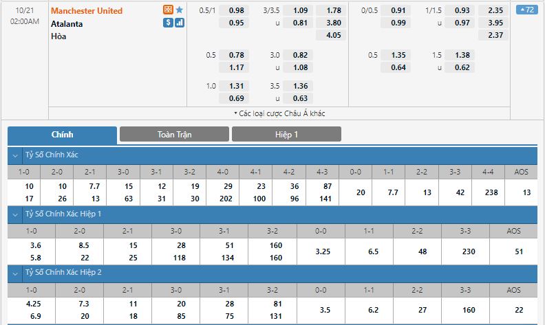Sự chênh lệch của hai đội ở thời điểm hiện tại là đủ để quyết định lựa chọn một chiến thắng cho Manchester United trên sàn giao dịch châu Âu. Những con số nhà cái đưa ra cho thấy cơ hội có điểm của thầy trò HLV Gian Piero Gasperini ở chuyến đi lần này đang nhận được khá nhiều nghi ngờ từ giới đầu tư. Nếu quyết định đầu tư ở kèo châu Âu, người chơi nên tin tưởng vào một chiến thắng cho đội chủ nhà.