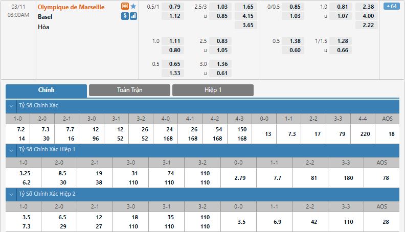 Bảng tỷ lệ kèo trực tuyến trận đấu Marseille vs Basel