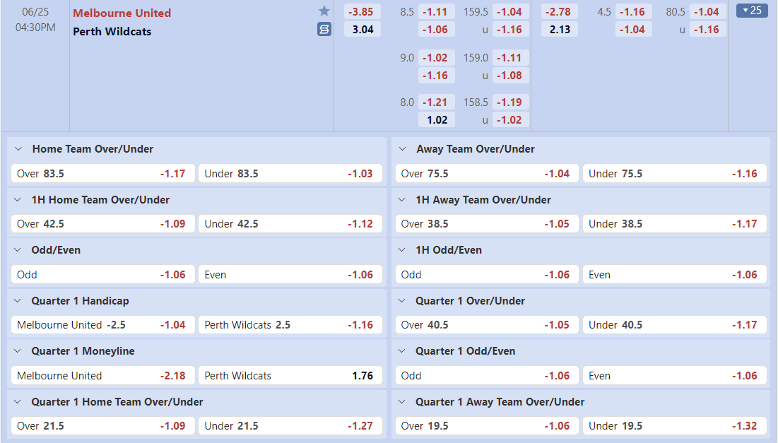 Bảng tỷ lệ kèo Melbourne United vs Perth Wildcats