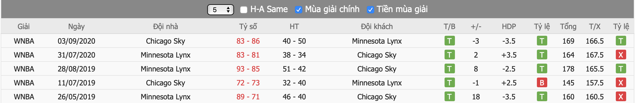 Thành tích đối đầu Minnesota Lynx vs Chicago Sky