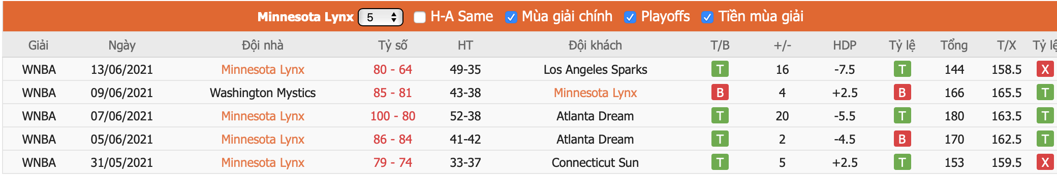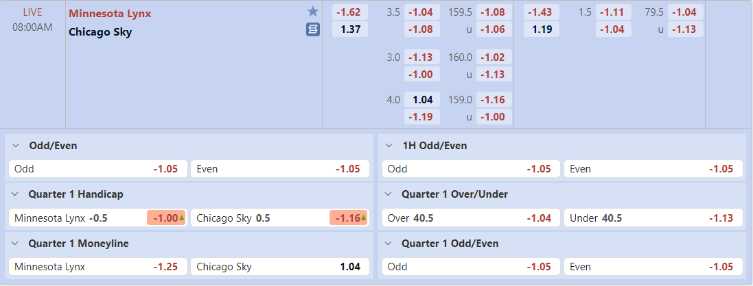 Bảng tỷ lệ kèo Minnesota Lynx vs Chicago Sky