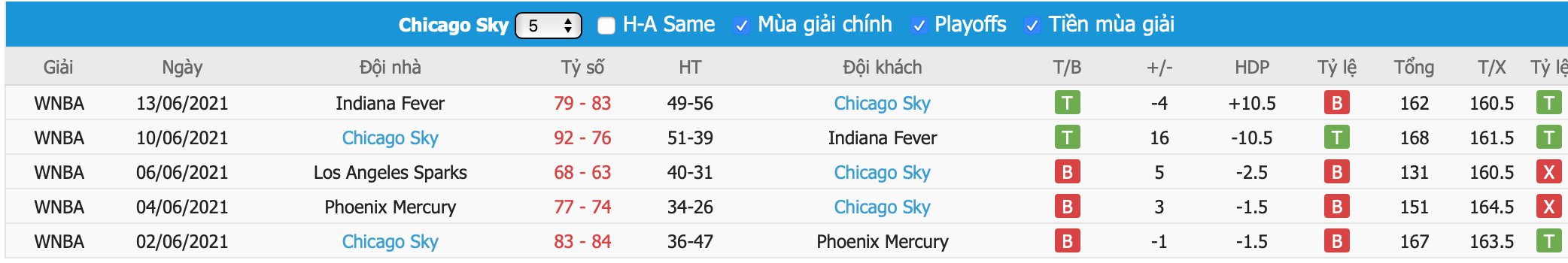 Phong độ gần đây Minnesota Lynx vs Chicago Sky