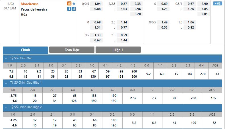 Bảng tỷ lệ kèo bóng đá Moreirense vs Pacos Ferreira
