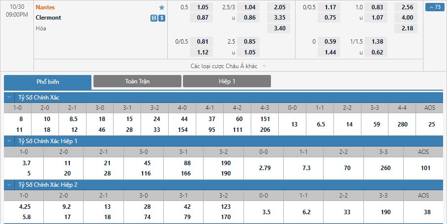 Bảng tỷ lệ kèo trực tuyến trận Nantes vs Clermont