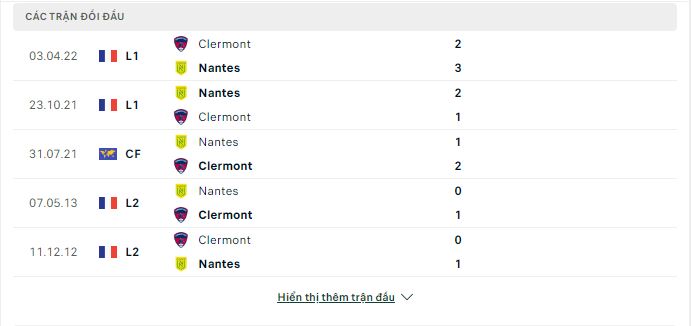 Thành tích đối đầu Nantes vs Clermont